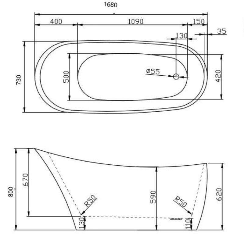 - Dimensions: 1680mm x 730mm x 800mm (high end) 620mm (low end)